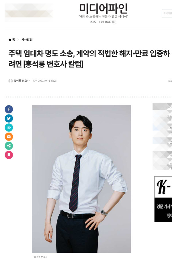 [미디어파인]"주택 임대차 명도 소송, 계약의 적법한 해지•만료 입증하려면" - 홍석룡 대표변호사 (2022. 10. 12.)